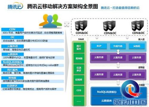 郑立峰的解释,很令人寻味。“腾讯是一家天生的云公司”。这种理解,我认为是可取的。腾讯的第一个产品QQ作为一个SaaS级的云服务,对整个IT的网络、IDC建设、负载均衡等依赖较强。腾讯游戏要应对游戏行业的快速兴衰,这使腾讯对IT资源部署虚拟化和精细分配不得不重视。Qzone和腾讯视频对网络和CDN(ContentDeliveryNetwork,即内容分发网络技术)、动态加速技术要求较高。微信和手机QQ带来了移动互联网挑战。 可见,腾讯云虽然正式开放的时间并不长,但其拥有的技术路径是他们几大业务的技术外化。这种技术本身,已经是腾讯公司的本能。腾讯云所输入的价值观,实则是腾讯公司自身对云技术的探索和应用积累的经验。 全方位的技术能力和服务 随着移动APP创业公司的大量崛起,他们逐渐会遭遇前文所提到的技术瓶颈。为了能够更好让他们摆脱困境,腾讯云也在尝试构建自己的云生态,除了对移动应用的创新企业进行支持,也在面向移动应用开发者开放一些技术环境。 在技术层面,腾讯云提供的移动解决方案已经相当完善,从云基础架构、高质量的云主机、高效可靠的NoSQL高速存储,到稳定安全的云数据库可谓应有尽有。
