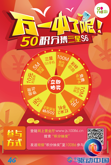 大转盘里50分钟免费通话、话费、充值券等礼品同样非常诱人。很多人还不知道你的积分有多少吧,赶紧登陆网上营业厅www.js.10086.cn,或者通过手机下载江苏移动掌厅APP查询。与其让积分躺在那里睡大觉,不如趁着夏天来此一搏,说不定心仪已久的三星S6、红米2就是你的呢! 这样的抽奖机会,只需50积分即可兑换一次,真正的以小博大。此外,当月连续兑换抽奖三次,还会获得一次额外赠送的抽奖机会。你兑换的次数越多,获得额外抽奖的机会也就越多,咱们赶紧行动起来吧。 只要你是江苏移动用户,从即日起到9月30日,就可以通过江苏移动开启的多条通道参与抽奖。您可以发送短信“积分抽奖”至10086,或者登陆网上营业厅www.js.10086.cn搜索“积分抽奖”,或者动动手指,扫描下方二维码进入江苏移动积分大转盘,丰富心动大奖只等您来试试手气。 唤醒沉睡积分,快来博取你的三星S6,用积分赢取幸运,好运连连转,欢乐赚不停。