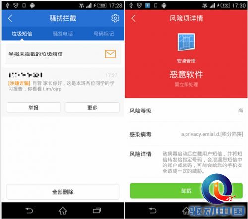 图:冒充老师发诈骗短信被手机管家拦截 冒充老师发成绩单类诈骗则主要利用窃取来的家长联系方式,以要求家长看成绩单为由让家长点击短信中的恶意网址,从而实施诈骗。 电信诈骗三大显著特征 手机管家安全专家表示,五大电信诈骗都具有三大显著特征: 首先,个人信息泄露十分严重。无论是网购退款,还是冒充老师发成绩单类诈骗,其源头都是因用户个人信息的泄露,诈骗分子精准拿到了受害人的网购记录、联络方式,然后根据这些精准信息编造诈骗情节,让诈骗变得十分精准,成功率极高。 其次,伪基站、网络改号软件的使用。一些受害人明明收到的是10086,95588发来的信息,却仍然被诈骗,就是因为诈骗分子利用伪基站可以模仿任意号码发来的短信,这也提高了诈骗的成功率。 另外,网络改号软件也可以模仿任意固定电话,然后再配合让受害人打114查询真伪的方式,骗取信任。这些高科技手段的利用,让诈骗成功率大增。