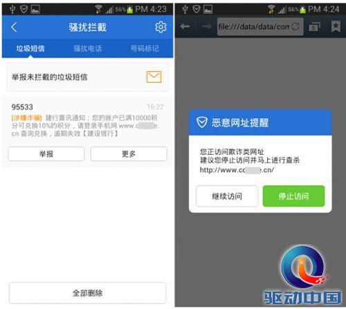 图:冒充建行的钓鱼网址 第三,钓鱼网址、手机木马病毒的利用。在以上五大诈骗案中,内置钓鱼或者恶意网址是惯用手法,通过这些网址可以记录用户隐私信息,同时还可向用户手机下载安装木马病毒。通过木马病毒可以有效的拦截并转发手机支付验证短信,从而可盗刷资金。 电信诈骗四大防范方法 对于电信诈骗,手机管家安全专家建议: 首先,不要轻易点开任何短信中的陌生网址。即使是官方客服号、手机联系人发来的的短信中的陌生网址都不要轻易点开,最好先将网址复制到PC浏览器中进行验证,目前QQ浏览器、搜狗浏览器、谷歌浏览器等都具有识别恶意网址的安全功能。 其次,安装腾讯手机管家的安卓手机,可以精准拦截此类诈骗短信和恶意网址。当用户通过手机浏览器打开该网址的时候,腾讯手机管家会弹窗提醒网址存在风险,建议禁止打开。 再次,不要到非安全电子市场下载应用,因为一些手机应用中可能隐藏着手机木马病毒,用户根本无法觉察。腾讯手机管家也可以有效查杀此类木马病毒,保护手机安全。 最后,呼吁对个人信息保护法立法,并且产业链各方要密切联手打击。2013年12月底腾讯手机管家牵头成立了天下无贼-反信息诈骗联盟,该联盟成员包含了警方、运营商、银行等产业链各方共超过100家会员,通过共享上亿号码库资源、网上网下结合方式打击垃圾短信、骚扰电话、电信诈骗黑色产业链。截至目前,天下无贼-反信息诈骗联盟直接劝阻1.84万名用户避免转款达1.56亿元,为9776名受害人快速拦截被骗资金1.09亿元,避免、挽回群众损失合计近2.65亿元。