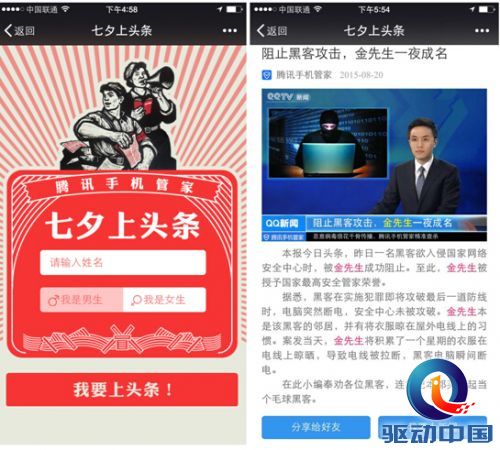 图:输入名字就可上头条 有营销专家表示,之所以腾讯手机管家的“七夕头条”借势活动火爆,主要把握住了几个关键点:简单、好玩、分享。 “有些借势活动需要用户填写资料,或者关注某个公众号,然后还有些搞虚假中红包的游戏,都非常复杂,而该活动只要输入自己的名字就能参加,非常简单;其次,添加名字后随机会产生一段主播文字和故事,背景图也会随之改变,非常有趣、好玩; 更为重要的是,由于主持人比较帅,所以很多男生愿意分享到朋友圈,借七夕来晒一晒,恶搞下。”专家表示。 由于用户疯狂的分享和参与,“七夕头条”活动迅速在社交网络中热转,而腾讯手机管家因此得到了1000多万次的曝光机会,也让该借势活动成为七夕营销的亮点。