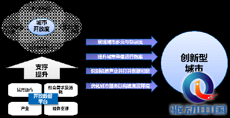 引子、中国智慧城市课题显现——领域与目标脱节而导致的战略体系缺失 智慧城市的构想由来已久。它从数字城市、无线城市等探索中演进而来,是基于21世纪ICT技术飞速发展、世界城市发展模式迅速转变的必然选择。以此为背景,近年来中国各地智慧城市的建设如火如荼。 中国智慧城市实践,领域导向意味浓厚。各地往往以智慧基础、智慧公共、智慧民生、智慧环境、智慧产业等为主要领域,其下通常又分出政务、交通、能源、环保、教育、医疗、金融、制造、旅游、农业等细分领域,力求全面。这种领域导向的建设思路,未能立足于本地的实际课题及目标设计智慧城市框架,从而产生同质化严重、商业模式缺失、示范项目难以推广、市民认同度不强等问题,也就不足为奇了。我们认为,各地智慧城市的建设,必须重新思考本市建设智慧城市所期望实现的城市目标,并以此出发,搭建符合本地需求的战略体系,谋划战略路径。 一、提升城市创新力应是思考智慧城市战略的重要视角 中国城市从经济规模、产业结构、环境压力、空间建设进程,再到各类课题的急迫程度,都有显著差异。本文将不进入个别城市的具体分析,而是从我国所处的整体发展阶段和涌现的新兴发展趋势出发,提出思考基本视角。 自中国经济告别两位数增长,新常态成为中国城市所面临的基本发展环境,创新成为新发展阶段中的时代主题。“中国制造2025”“互联网+”等新产业政策,均将创新作为发展主线;北京、上海、深圳等国内顶尖城市,亦不约而同将创新明确为核心发展战略。因此,我们认为,提升创新力应是各地思考智慧城市战略的基本视角。以激发创新为标尺,审视本地在基础设施、空间魅力、管理与服务、机制与体制、政策软环境等方面的不足,进而研究如何通过智慧城市建设弥补不足、解决问题,方能使智慧城市建设真正贡献于城市的切实发展。 二、开放度的激活是智慧城市支撑创新力提升的发力点 在深入研究本地创新各环节不足之处的同时,应该认识到,智慧城市支撑城市创新力的提升作用可首先归结于城市开放度的激活。开放度主要有以下四个方面的内涵:第一,交通的通达度与空间效率,即通过提升交通便利性和空间集约度,实现资源整合集聚;第二,多元文化的包容度,即通过促进人才构成的多元,艺术文化的多元,企业活动的多元,推动创意活力城市的建设;第三,企业创新网络的构筑,即搭建创新网络,为企业提供信息获取、互动交流、资源共享的渠道,从而激发新服务、新产业的创生;第四,公共服务参与的放开,即通过大力引进民间力量,促进城市服务的品质提升和创新发展。 开放度的激活是智慧城市支撑创新力提升的发力点,而开放数据平台则对于开放度的激活起基础性的支撑作用。简单来说,开放数据平台通过各种信息收集途径,从城市运行、社会需求及消耗、行业信息、公共服务等角度,建立城市数据库并对数据进行分析、挖掘、共享及交换,向企业、学术机构、个人开放并鼓励利用,最终达到展现城市多元及包容度、提升城市运行效率、识别机遇产业并拓展创新可能、优化服务构建宜居环境的目的。(图1)