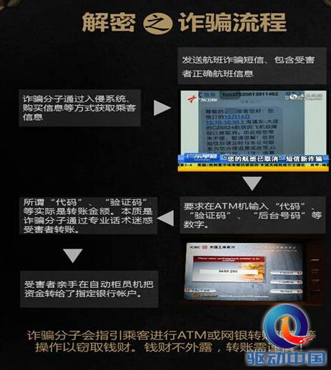 (图:腾讯手机管家精准拦截航班取消诈骗短信) 除了类似的诈骗手法外,陆兆华还列举了其他两类诱骗转账的手法。其一,也是以20元改签费要求受害人转账,并以需要核实银行卡额度为由询问受害人卡内余额,然后要求受害人在转账金额一栏上先输入0+一串数字(小于卡内余额),并解释输入“0”是航班取消的意思。再受害人因输入金额格式不正确的无法完成,就让受害人把“0”去掉再试试,结果卡内资金被转走。 其二,以受害人不懂ATM机或者网银转账步骤的弱点,要求受害人在支付20元改签费的时候在转账框中输入一个所谓的航班取消代码,结果受害人的资金被立即转走。 航班取消?看骗子如何使诈 据腾讯移动安全实验室根据海量大数据制作的《防骗启示录——解密航班诈骗篇》显示:诈骗分子发送短信的时间一般在航班起飞的前一天进行,45%的诈骗短信发送时间大于12小时,小于24小时;诈骗分子最爱冒充的航空公司中,东方航空占比最高为37%、20%海南航空、9%四川航空;93%的诈骗短信从中国香港发出,警惕00852开头的航班取消短信。 那么,骗子究竟如何使诈?首先,通过黑客入侵售票网站窃取购票人精准信息,或者通过非法渠道购买受害人购票信息。