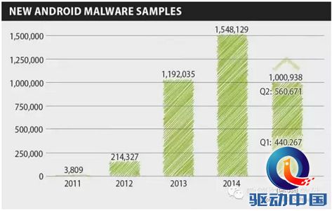 据《2015年第二季度GDATA移动恶意软件报告》显示,2015年第二季度新的安卓手机病毒样本数达到了560671,比第一季度增长了27%。第二季度每天出现6100个新的安卓病毒样本,比第一季度多1200个。每14秒钟就有新病毒出现。2015年上半年病毒数量创历史新高,专家预计2015全年新安卓病毒数量会超过2百万。
