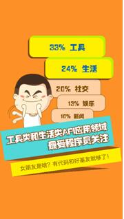 近日,APIStore公布了一组API调用情况数据,让我们有机会据此观察互联网各领域的真实热度。APIStore是百度旗下的一个第三方API分发平台,平台汇聚了国内外800余个API,覆盖图像语音、地图翻译、储存测试、短信推广等众多领域,聚集了国内50W开发者,因此该平台的数据体量和覆盖广度具有较高参考价值。 根据APIStore公布的数据,在API的应用领域,工具类高达33%,位列第一,之后依次是生活类24%,社交类20%,娱乐类13%,新闻类10%。这个数据可以反应出各领域应用的开发热度,即有多少开发团队进入这个领域掘金。工具类包括地址、天气、翻译、通讯、查询、支付、搜索等,是搭建各类应用的基石,高居榜首理所应当。其中也有专门的工具类应用,比如万能助手、万能查询,以及服务WP系统的wper小助手。第二名生活类包括交通、医疗、旅游、健康,可见超过1/5的开发团队看好衣食住行市场,电商、O2O、互联网金融的核心数据也属于此类接口。这些领域以鲜活的生命力一举超过社交领域,然后生活与社交接下来谁消谁涨却尚未可知。