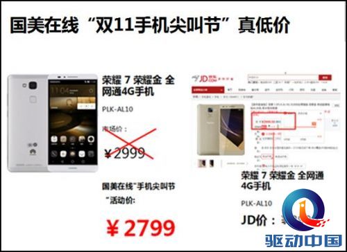 推荐商品: 华为 荣耀7 PLK-AL10全网通荣耀金4G手机 心动价格:国美在线双11尖叫价2799元 比京东低200元 推荐理由:“华丽丽的智能安全机” “智灵,懂我所说”华为荣耀7华丽丽的安全机型,配备指纹识别2.0技术,后置摄像头配备蓝宝石镜面,无惧摄像头刮擦,任凭你怎么造?。更让人惊喜的创新拥有免接触语音唤醒功能,完全解放双手,尽情享受高效率与慢生活。国美在线仅售2799元,比价京东便宜200元。