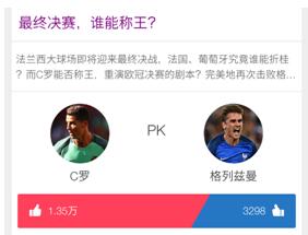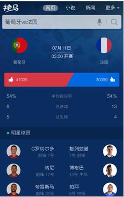 活动页面中,神马搜索精练了两只球队在本届欧洲杯上的核心数据和球星,无论是高手还是小白用户都可以通过数据对比来选择自己支持的方阵。虽然在比赛数据上葡萄牙落后于法国。但在球迷支持率上则呈现了相反的结果,这点在C罗PK格列兹曼上体现的更加明显,四倍的差距也证明了中国球迷对C罗的偏爱有加。