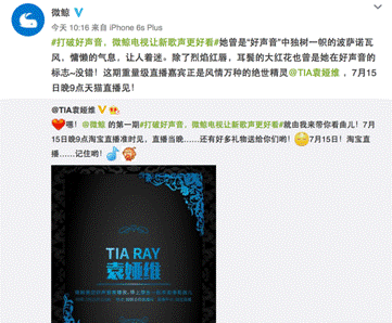 女神袁娅维领衔明星直播团历届“好声音”大咖轮番登场 从《中国好声音》到个人演唱会,不论是R&B、Hip-Hop、民乐、Soul等糅合的曲风,还是她大气、灵动、富有爆发力的骚灵唱腔,都给了听众耳目一新的摩登味道。她在综艺节目上也不断爆发着自己天才般的创作实力,让更多观众看到Tia在音乐上的可能性。Tia一向用自己的态度做着属于自己的音乐,面对音乐的这份坦然和执着也是身为一个音乐人难能可贵的,Tia的坚持让我们看到一个真正音乐人对于音乐的那份无穷的力量。