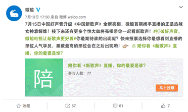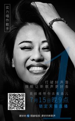 袁娅维一路走来,无论是音乐、综艺还是广告可谓是“火力全开”,亮眼的表现吸引了来自四面八方的关注,好评不断,如今她首次尝试直播,以#打破好声音,微鲸电视让新歌声更好看#为主题,带着观众一起看曲儿,值得一提的是在此次直播中,还会有微鲸55英寸曲面大屏电视和丰厚红包任性派送! 除了袁娅维之外,微鲸还计划继续邀更多明星,带观众一起直播观看新歌声,现正在微博发起投票活动,刘明湘、多亮、李琦等多位从”好声音”舞台走出来的个性大咖纷纷在列,想要哪位明星陪你看新歌声?速去微鲸微博投票!