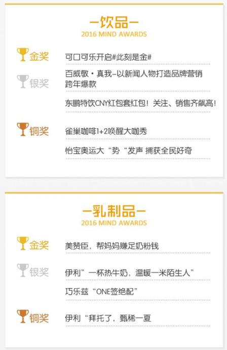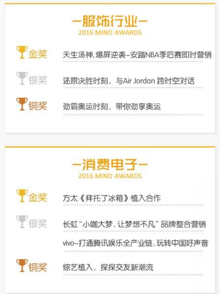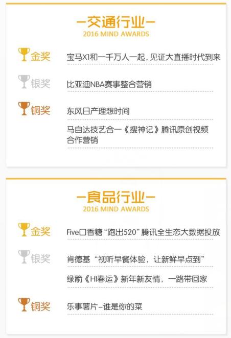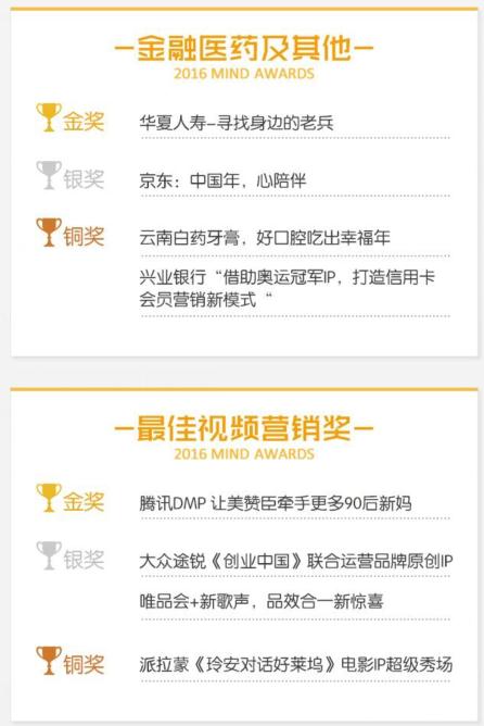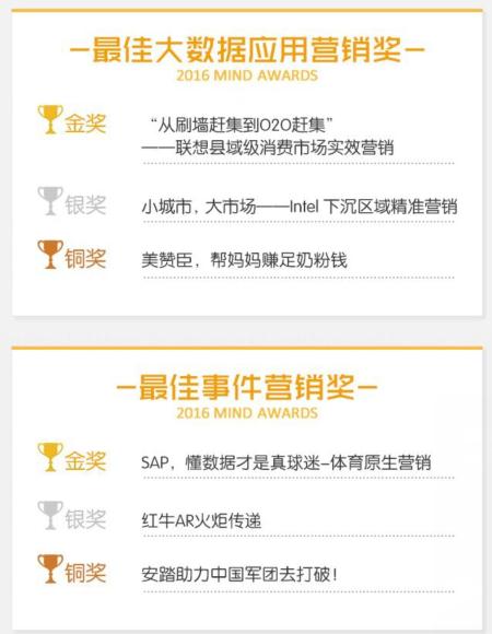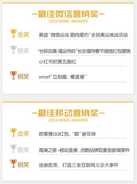 “奥迪‘微信运动,跑向里约’全民奥运挑战活动”获得腾讯2016 MIND AWARDS最佳创新营销金奖 腾讯网络媒体事业群策划交付部总经理范奕瑾在总结时表示:移动互联技术和大数据的应用,正在推动营销创新的升级,和营销的场景化趋势。从本次MIND AWARDS获奖案例中,已经清晰的看到基于技术的营销创新成为当下的主流。而在未来,随着技术的进步,这种创新还将进一步深化,让技术与数据,成为未来营销的基础和灵魂。 附:腾讯2016 MIND AWARDS获奖名单