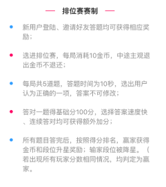 全民答题中的排位赛可看作是日常训练答题场,升星get高段位能为赢取现金大奖做准备。玩家进入排位赛,每场消耗10金币即可进入赛场作答,答对一题得基础分100分,选择答案速度快、连续答对均可获得额外加分,答错或超时答题不得分,但可继续作答,完成答题后,按照得分排名,赢家获得金币和段位升星奖励,输家段位将被降星。而赢得的金币可换取进入红包赛场的入场券。
