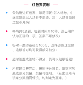 全民答题中的红包赛,则可看作是排位赛的进阶版。玩家凭入场券进场,系统自动匹配2至8人后,可开始作答,完成答题后,按照得分排名,排名越高奖金越多。据了解,赢家1分钟最高可赢百元现金。