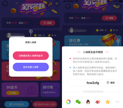 储备“入场券”赢更多奖金 UC全民答题玩法突破“同质化” 值得注意的是,除了在排位赛中赢取更多金币,以此换取进入红包赛的入场券外,玩家还可通过邀请好友填写你分享的邀请码参与答题,双方各得1张入场券和30金币。两种方式解锁更多入场券,可增加赢取现金大奖的机会。