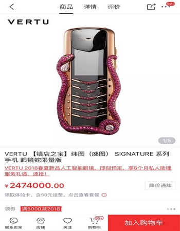 价格最贵:VERTU手机 247.4万元(年货节支持满5000减2018元优惠券) 支持京东年货节满5000减2018元优惠券,堪称历史最高幅度优惠。这款被网友称“卖肾都不够,贵到没朋友”的VERTU手机被推为官方旗舰店的“镇店之宝”,相信你一定想知道,它究竟贵在哪?据小编深扒后发现,打造这款眼镜蛇限量版手机,共计耗费八位工匠四年时间,并且真机368个零件全部由手工组装,手机键盘也由红宝石做铺垫,整机共计使用439颗红宝石,堪比绝世珍宝。 不过需要注意的是:该机并未采用流行的安卓操作系统,无法进行美颜、玩王者荣耀等大家已经习惯的日常应用,下单前请仔细了解。