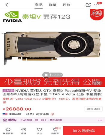 跑分最高:NVIDIA TITAN V显卡(全球购) 这款号称“迄今为止性能最强大的PC显卡”TITAN V,轻松超越上代卡皇Titan Xp,各种跑分成绩是后者的125%以上,至于很多玩家手里视为核弹的GTX 1080 Ti更是被残忍碾压。TITAN V采用了12nm工艺Volta架构制作,拥有12GB HBM2显存,其运算能力最高峰值能达到110TFlops,被业界称为一枚“氢弹”。 此前,据国外网友MrOmgWtfHaxo测试,TITAN V在《古墓丽影崛起》1440P分辨率下最高画质的平均帧数是66帧;在《战争机器4》的1440P分辨率最高画质下游戏的平均帧数是158帧;在《奇点灰烬》同上的画质设置下游戏的平均帧数是88帧,均为史上最高水平。目前该卡在京东全球购的年货节里有少量现货,有兴趣的朋友可以买来在春节期间鉴赏一番,小编等你的晒单哦!