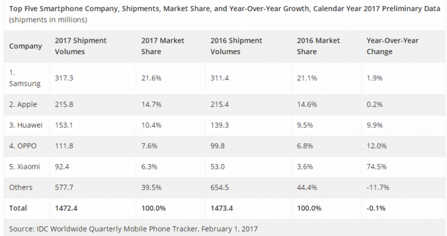 不知不觉间,已经迈入2018年两个月有余。最近,诸多市场调研机构开始陆续发布2017智能手机行业出货量报告,全球第一依然是在苹果和三星这两大传统巨头中决出,但国产手机品牌的崛起也成为人们关注的焦点。
