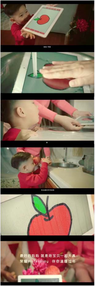 这个看上去极其简单的故事,荣耀官方想传达的不仅是荣耀Waterplay这款防水影音平板本身的功能亮点,结尾点题的那句话“最好的妈妈,就是陪宝贝一起天真”,可谓是更深层次地传达出一种看似与传统的中国式教育背道而驰的理念——看到孩子做错了,不是简单粗暴地纠正斥责,而是原谅宽容孩子这样“不经世事”地表现,去呵护甚至是帮助其展开发挥想象力。妈妈能在短短的几秒钟内,想到“洗真平板换真苹果”的浪漫妙招,可谓是别有一番心境。