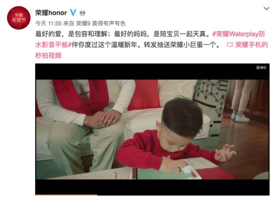 今日,荣耀手机官微重磅发布2018新春视频《最好的妈妈 就是陪宝贝一起天真》,视频一经推出,立刻引起诸多微博大V转发,评论也掀起了一阵热烈讨论。瞬间接力了前几天陈可辛导演的iPhone X过年视频的热度效应,而这部作品的主角,则是2017年度斩获佳绩惊艳行业的安卓平板领头羊——荣耀Waterplay!究竟是怎样的内容,吸引了众人的目光,使得这支不过45秒的视频,从各大品牌扎堆的新春视频中脱颖而出?