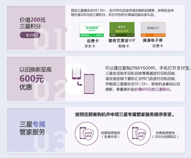 升级版专属管家服务:针对手机因意外跌落、碰撞、挤压受损所导致的屏幕(包括显示屏或触控屏)碎裂等情况,三星为消费者提供了6个月的优惠换屏服务,在限定期限内,消费者便可以用优惠价格进行一次屏幕更换服务。同时,消费者也可以选择支付很少的费用,将6个月的优惠换屏延长至12个月。除此之外,专属管家还包括12个月的电池性能检测和优化、5折电池更换服务、绿色通道服务以及24小时VIP服务热线,为消费者提供无忧的售后服务体验。 物超所值的以旧换新活动:用户只要使用指定机型参与活动,便有机会获得最高价值600元三星积分。参与方式分为两种,消费者可在爱机汇指定合作的线下门店现场进行旧机估价回收并直接抵扣新机款。或者也可以选择线上回收,通过三星生活助手对旧机在线估价后,将旧机邮寄回收。并且,三星还与爱回收推出了信用回收服务,凭借芝麻信用,用户在寄出旧机时就可以提前收到部分回收预付款。 消费者关注微信公众号“三星会员俱乐部”并支付99元预约金,三星专门为购机顾客提供价值200元三星积分和99元微信红包。并且用户还可参与有机会获得最高价值600元三星积分补贴的“以旧换新”活动,以及获得升级版的专属管家服务,累积可获千元好礼!