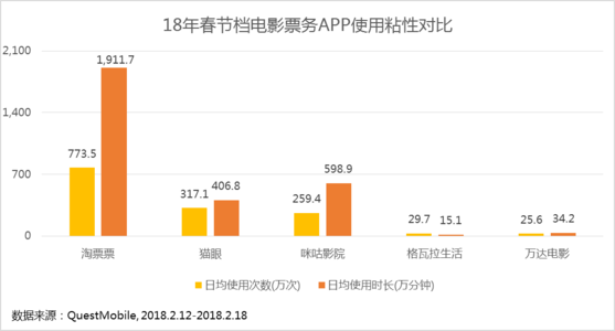 在接下来的几天,淘票票均保持了接近四成的成绩,势头发展及其平稳。2018春节档过后,猫眼微影和淘票票在市场份额方面的差距已不到10%。 而就在2017年下半年,猫眼与微影才完成合并,目的便是抱团取暖以对抗淘票票的进攻势头。目前看来,这一联合未过多久,聚合效应的优势已经流失不少。 反观淘票票一年多来的动作,应对策略一直保持不变:打开电影增量市场,保持进攻姿态,争夺行业第一位置。 在2017年年初,淘票票通过一系列对用户的触达和鼓励政策,增加了用户打开APP频率与发表影评次数。据Quest Mobile数据显示,2017年1月30日至2月5日,淘票票日均活跃用户以62.6万首次反超猫眼,并在接下来的一周里,以周活跃用户180.05万首次登顶。值得一提的是,淘票票的用户粘度还在2018年春节档期间持续发酵,形成了源源领先其他票务平台的绝对性优势。