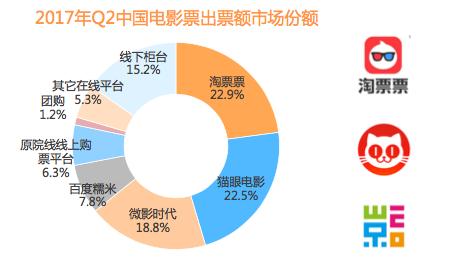除了巩固用户粘度,淘票票还将经历投入到了电影宣发,主导了《一条狗的使命》、《战狼 2》等口碑与票房双赢影片的宣发工作。借助《战狼2》56亿的现象级票房,淘票票终于在2017年8月,以30.94%的市场份额成为国内票务平台业内第一。 猫眼与微影合并后,以超过50%的市场份额反超淘票票。春节档数据则表明,这一绝对性市场优势,在5个月后已经被淘票票拉近到不到一成的差距。 微影合并后遭瓜分,市场份额被淘票票占领 一直以来,博弈论中的“双寡头”规则一直得以印证。在竞争激烈的某一领域,最多只能容纳两个巨头掌握绝对话语权。 猫眼与微影合并,同样是这一规则作用下的市场选择。然而问题在于:合并完成后,新的共同体能否够达到双方市场份额的相加值? 从淘票票市场份额的变化看,从2017年Q2的22.9%到春节档的43.6%,淘票票的市场份额提升了20%多,达到了历史最高值。而此前淘票票、猫眼、微影“三足鼎立”的状态,变成了现在淘票票与猫眼平分天下。