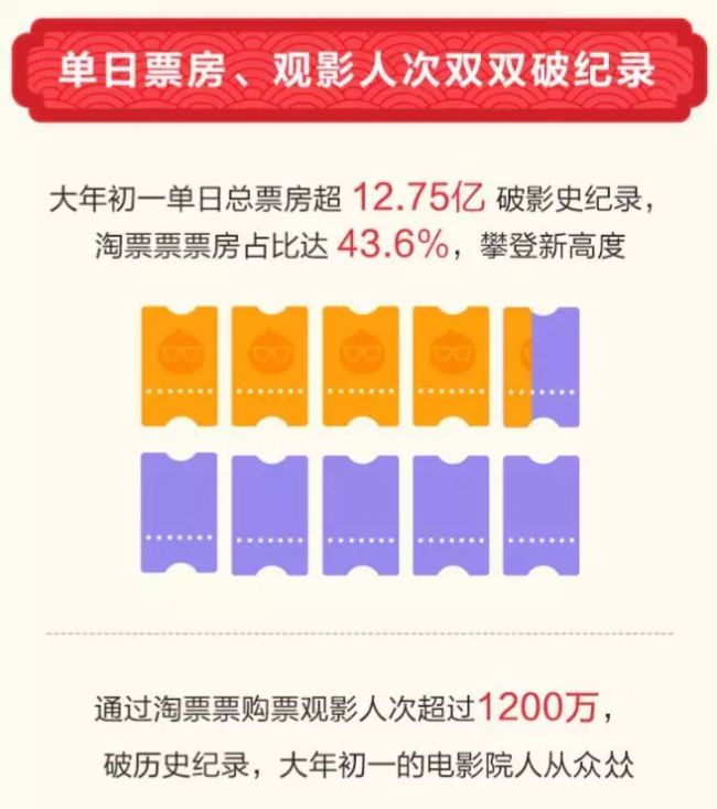 春节档淘票票出票近四成,市场份额直追猫眼 从春节档表现来看,淘票票的表现增势未减:大年初一零点刚过不久,全天票房就已超过6亿元,其中淘票票出票681万张,出票份额达到41%;这一天票房最终以巅峰般的12.75亿元收盘,淘票票直接参与创造了这一单日票房记录,承接了1200万的观影人次,出票份额最高达到43.6%。