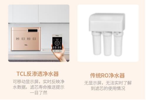 以TCL今年最新推出的净水器新品TRO509-4为例,该产品不但采用高端RO膜反渗透过滤技术,实现0.0001微米的高过滤精度,净化实力超群,而且在智能化体验上带来更多惊喜:该产品专设移动显示器,实时反映净水数据,净水效果一目了然。为了切实保障用水健康,这款TCL净水器更有贴心的滤芯寿命推送显示,及时提醒更换滤芯,杜绝“二次污染”隐患。TCL净水器TRO509-4设计便捷,家中老人也可简单操作,用户也可以使用手机下载APP随时操控,开启智能净水新时代。