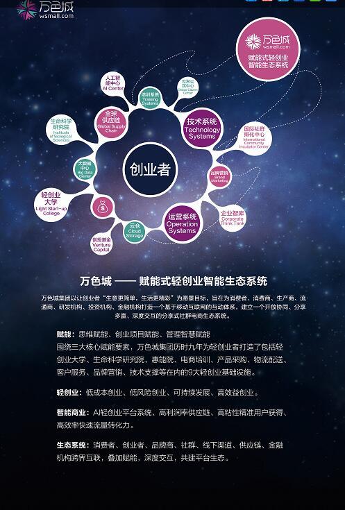 据了解,万色城集团创立于2009年,以创建一座网上创业大学城为愿景,贯彻“生意更简单,生活更精彩”的经营理念,是一个致力于把草根创业者培养成未来创业家的轻创业平台。万色城聚焦于轻创业平台基础设施建设,为草根创业者提供创业教育、创业项目孵化和实战型创业人才培养的赋能式服务,同时,为消费者、消费商、生产商、流通商、研发机构、投资机构、金融机构打造一个基于移动互联网的互动体系,建立一个开放协同、分享多赢、深度交互的分享式社群电商生态系统。