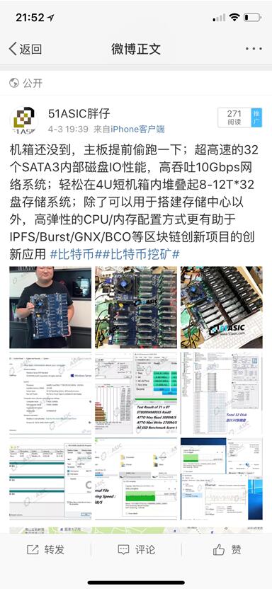 小编私信了这位51ASIC胖仔;胖仔表示这片主板除了常规的存储应用外;主要的目标群体是IPFS/Burst/GNX/BCO等分布式存储项目的矿业参与者;与现有的比特币以太坊等挖矿形式,基于硬盘系统的矿机安静省电节能环保,且永远无法被ASIC化(指的是算法固化在专用集成电路中),长期来看是另一种更加先进的区块链承载方式。