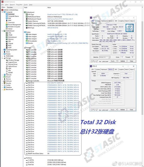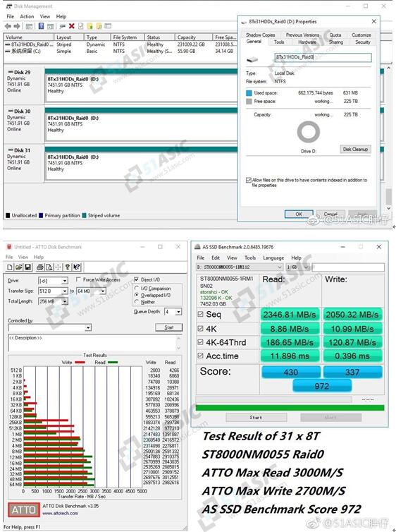 博主还晒出了几张系统测试图,可以看到系统安装在一片OCZ 60G SSD上,其余的31个SATA全部安装了希捷8T企业级硬盘,利用Windows的动态磁盘功能组成了单个容量高达225T的Raid0阵列,阵列的持续读写速度逼近3000MB/S。