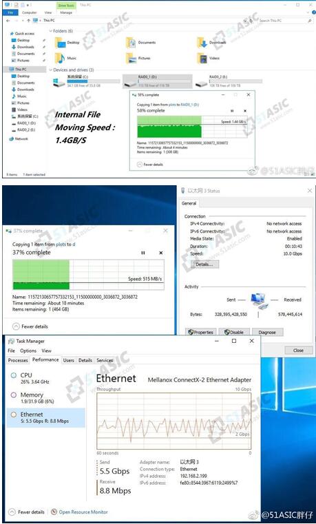 另外还展示了双阵列间的文件拷贝速度以及通过10GB网卡的局域网文件复制速度。