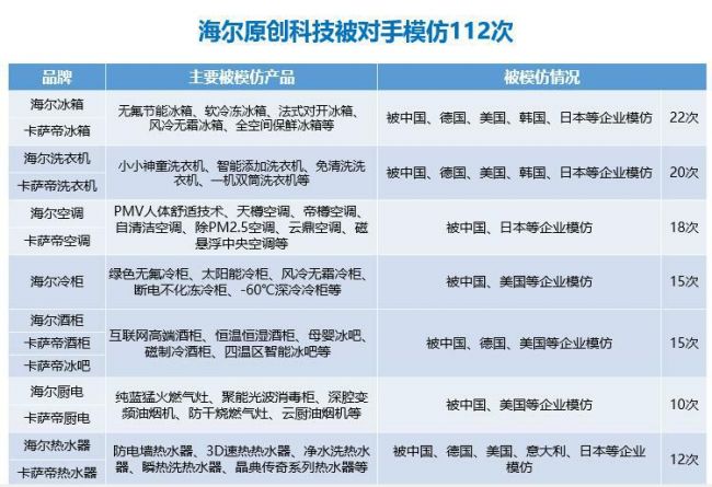 实际上,海尔原创科技第一实力早已得到了行业的认可。据不完全统计,海尔的原创科技被对手模仿次数高达112次,参与模仿的竞争对手来自中、德、美、韩、日、意等国家。不过,海尔在原创科技领域的独特优势,也让海尔的无压缩机酒柜、分区洗洗衣机等产品至今无法被对手模仿出来,这也从侧面体现出海尔能够为行业提供标准范本的科技底蕴。