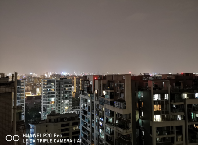 再来看看这组样张,华为P20 Pro是手持6秒超级夜景拍摄样张,这是它的杀手锏之一。 我们都知道,夜拍最考验手机镜头的素质,往往很多手机在夜拍就原形毕露,但是华为P20 Pro的AI识图会在夜拍当中直接开启“超级夜景模式”,“超级夜景模式”是完全可以手持的多张合成出片,不需要三脚架,但能够把整体亮度进一步大幅度提升。如上对比样张,不管是近处的墙壁,还是远处的灯光和云彩,华为P20 Pro都能够拍清晰,但是苹果iPhone X却是模糊一片。