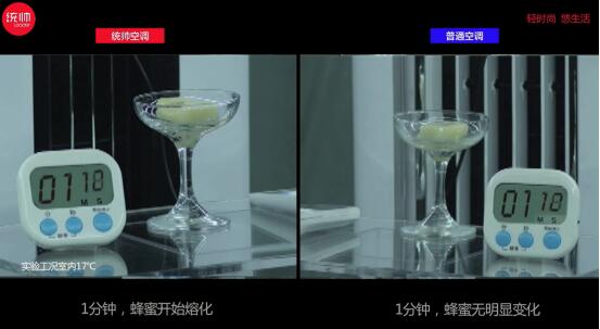 在此基础上,统帅空调1分钟让蜂蜜结晶、化冻的视频横空出世,视频中统帅空调的制冷制热性能明显优于传统空调,展示了领先行业的技术水平。据悉,经国家日用电器质量监督检测中心检测,统帅空调启动正常出风后,出风温度变化速率最高可超过十秒十度(指定型号及工况,实验室下测试数据)。这一全新的数据再度刷新了空调行业的制温速度,将统帅空调的创新理念展露无遗。
