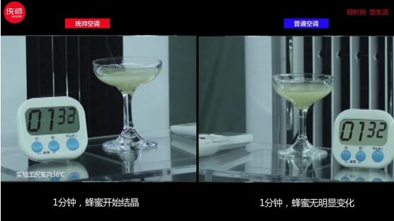 在此背景下,统帅空调率先响应用户诉求,创新研发 “跃频技术”。据悉,经国家日用电器质量监督检测中心检测,统帅空调启动正常出风后,出风温度变化速率最高可超过10秒10度(指定型号及工况,实验室下测试数据)。对比蜂蜜在空调下的变化也能很明显的观察到,统帅空调的“10秒10度”已经彻底拉开了与行业的距离,不仅创造了行业最快的制温速度,更充分满足用户的使用需求,为他们创造了更加便捷、舒适的生活方式。