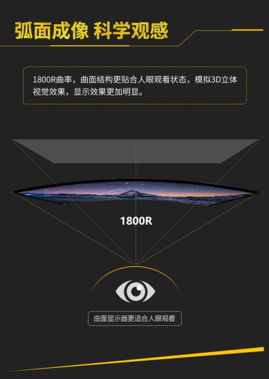 1800R黄金曲率,与人眼弧度完美贴合,带来模拟裸眼3D的沉浸效果