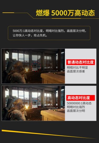 采用5千万:1动态对比度,呈现出色彩分明的游戏场景,能够看清战场的每一个细节,在第一时间看出隐藏在暗影中的敌人;1670万色数,还原真实视界,让玩家快速做出反应,杀敌致胜,让敌人的埋伏反变成被埋伏!