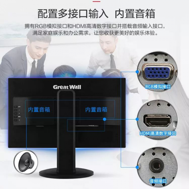 资深白领人士肯定深有体会,无论是与甲方还是乙方交流,就沟通的精准度和效率来讲,文字信息始终比不上直接打电话,而打电话又比不上见面谈,而网络视频会议就是“见面谈”的高效版。Great Wall 24AZ86PH/2商务显示器采用HDMI高清接口及音频输入接口,内置音响,再另搭配网络摄像头,提供一步到位的视频会议硬件解决方案。开展网络视频会议,传输速度快,操作更便捷,让商务会谈达到事半功倍的效果。