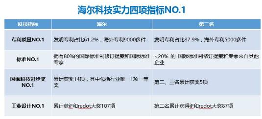 此外,海尔原创科技NO.1还体现在专利、工业设计、国家层面的科技认可3大领域的成果上:海外专利方面,海尔数量近9000件,覆盖25个国家和地区,是中国家电海外专利布局最多的企业;工业设计方面,海尔累计获得国际设计大奖137项,数量位居中国家电企业第一;国家科技进步奖方面,海尔共获得一等奖1项、二等奖13项,总数是第二、三名之和的近3倍。
