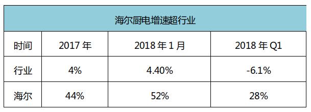 2017年全年海尔厨电整体增长是厨电行业增速的4倍。2018年1月份厨房电器行业增幅4.4%,而海尔厨电增长为52%,实现跨越式增长。2018年1季度厨电市场整体下滑6.1%,海尔厨电2018年1季度净收入增速28%,高端增长221%,呈现逆势高增长。
