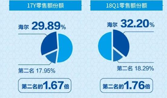 4月26日,青岛海尔发布了2017年年报及2018年1季报。报告显示,2017年及2018年一季度,海尔洗衣机的市场零售额分别达到了29.89%和32.20%,分别是第二名的1.67倍和1.76倍,继续稳居行业第一。