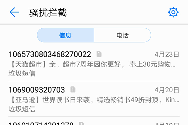 这里要好好表扬下华为P20手机的骚扰拦截功能真是很强大,不会有漏网之鱼。这也是华为手机一贯擅长的,相对于发送短信0000关闭端口等操作来说,把所有的拦截工作交给手机其实是更明智的方法,既起到了同样作用,又不会因为错误关闭端口带来麻烦。