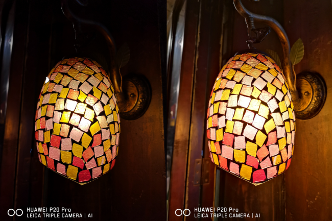 如上样张,拍摄的是旅游区小街上的一盏灯,画面亮度非常高,但是灯的颜色却表现的非常艳丽,噪点控制也非常到位,尤其是右边的手持4秒拍摄样张,亮度更高,但是没有用三脚架,画面却没有丝毫的模糊,这是因为华为P20 Pro最长支持6秒手持拍摄,该技术主要通过AI技术分析、整理拍摄过程中每个画面的特征点,识别物体形状及边缘,自动抓取4-6秒曝光时间内生成的所有照片,并借助AI算法过滤、校正,最终得到远远高于其他手机的亮度的样张。