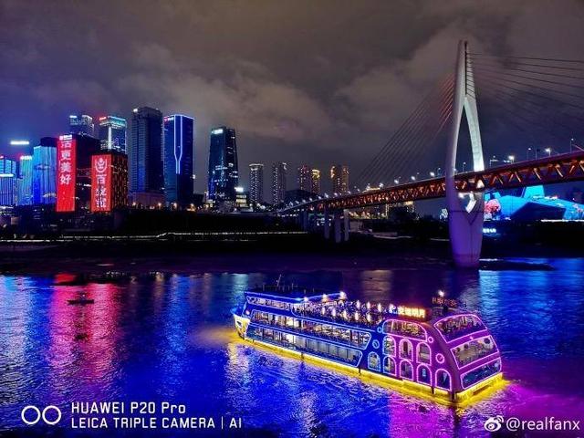 由于这次五一没有去大城市里旅游,那么我在微博上找了一张摄影师拍摄的城市夜景,华为P20 Pro所拍的这张照片亮度如白昼一般,天空的噪点控制的很不错,而且无论是远处楼宇的室外大屏幕还是桥上的路灯以及近处游船上的多彩灯带,色彩都表现得相当艳丽,就连水中倒影也解析力很强并未模糊一片,效果惊人。