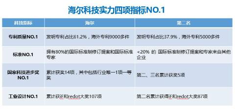 有海尔强大的原创科技No.1实力做支撑,海尔主导上述两国家电标准的制定并不意外。在海外专利方面,海尔数量近9000件,覆盖25个国家和地区,是中国家电海外专利布局最多的企业;工业设计方面,海尔累计获得国际设计大奖137项,数量位居中国家电企业第一;国家科技进步奖方面,海尔共获得一等奖1项、二等奖13项,总数是第二、三名之和的近3倍。