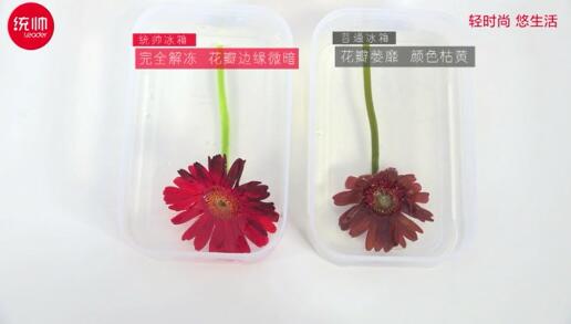 实验中,统帅L.ONE冰箱中字抽屉和普通冰箱变温区分别被放入同等条件的两支鲜花,在-20℃和5℃环境中分别存储48小时和24小时。可以看到,-20℃冷冻48小时后,普通冰箱的鲜花开始萎缩,颜色变暗;5℃的时候,普通冰箱的鲜花整体上现萎靡之态,颜色几乎全失,花梗也变软变灰;而统帅冰箱内鲜花依然鲜活如初,花梗嫩绿坚挺。