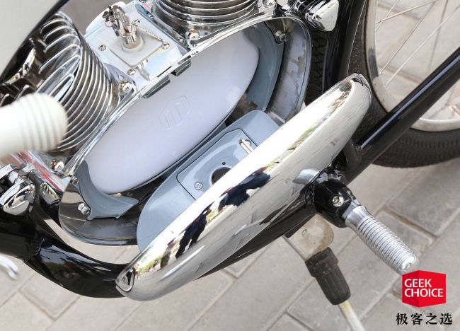 从下图中可以看到,它的两块电池分别置于电池仓两侧。需要说明的一点是,虽然它可以同时配备两块电池,但在车辆行驶过程中,只有一块电池工作,另外一块只是作为备用电池。