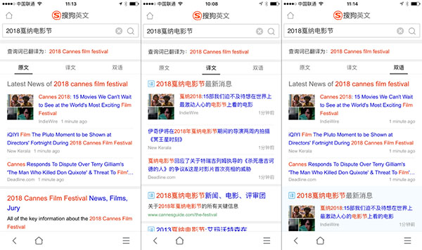 例如,检索“2018戛纳电影节”,搜狗英文搜索的结果页便汇集了来自英国《卫报》、电影数据网站IMDB、知名电影媒体Indie Wire等海外权威网站的最新报道。这些优质内容还以“原文”、“译文”、“双语”三个页面呈现,一键切换即可选择性阅读,点开每篇报道的网页链接,均提供了“中文”、“英文”两个能自由切换的阅读页面,其翻译精准度高达90%以上,即使英文能力有限的读者也能直接读懂这些一手英文报道。