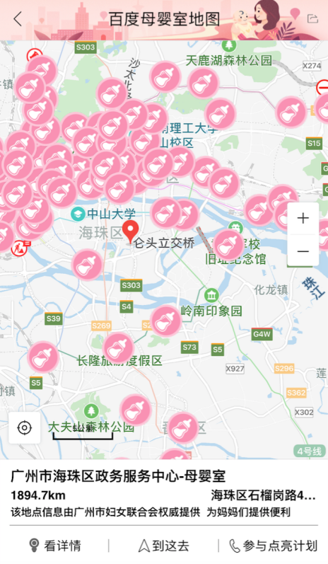 目前,百度地图已联合广州妇联,上线160家优质母婴室的信息,其他城市也将陆续上线,从而为公共场所中寻找母婴室的母亲们提供贴心便捷的服务。