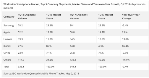 如今,手机市场已经告别了高爆发的圈地时代,而进入了高竞争的战国时代。5月2日晚IDC发布数据显示,2018年第一季度全球智能手机市场出货量同比下降2.4%,中国市场的出货量自2013年第三季度以来首次跌至1亿部以下。